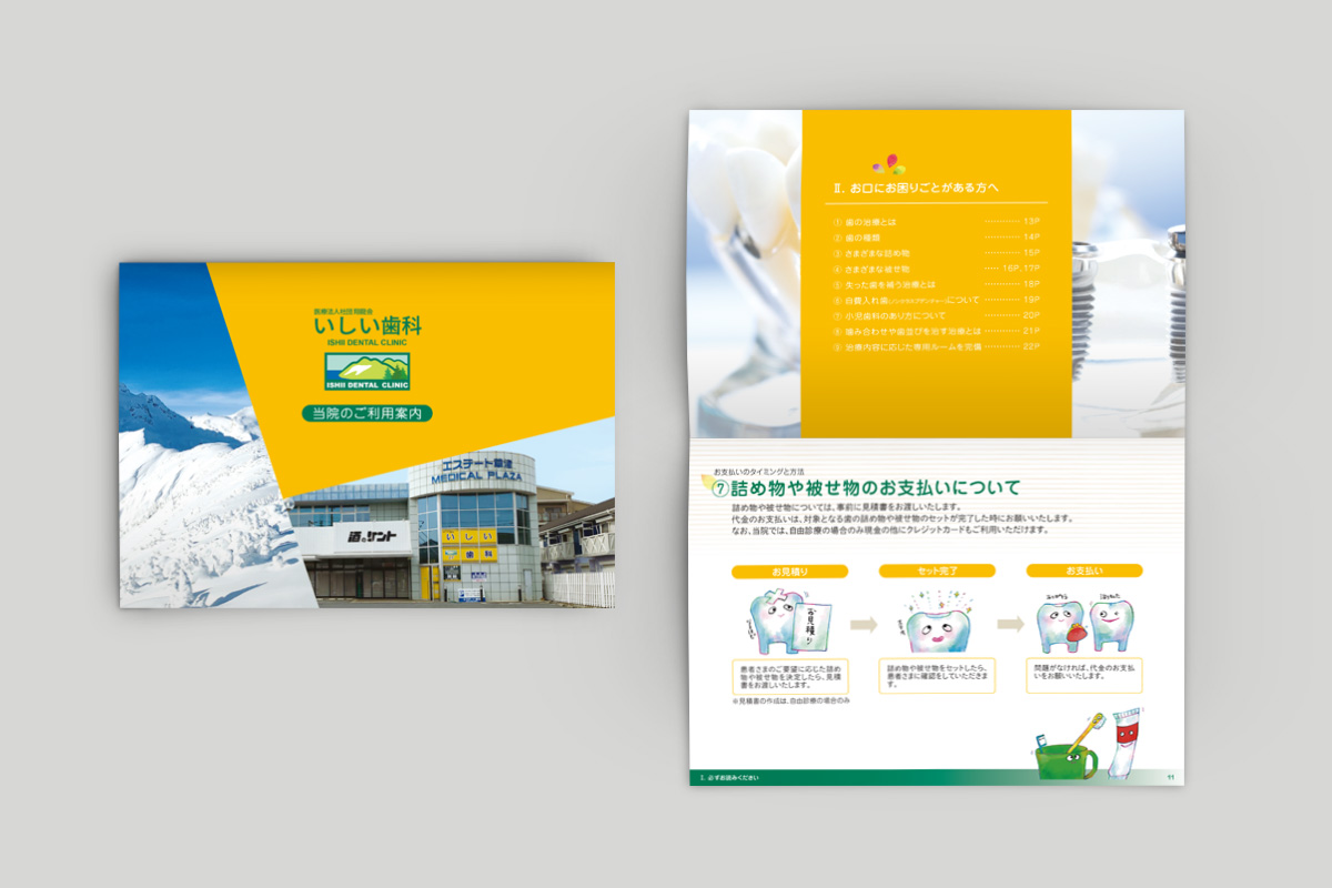 Book 2022.02.15 2020 FLYER/POSTER いしい歯科 様「クリニックのご利用ご案内」 http://ishii-shika.jp/ 中綴じ冊子(B6サイズ) 24P コート紙135kg/フルカラー ギャラリーアーカイブ PREVIOUS NEXT