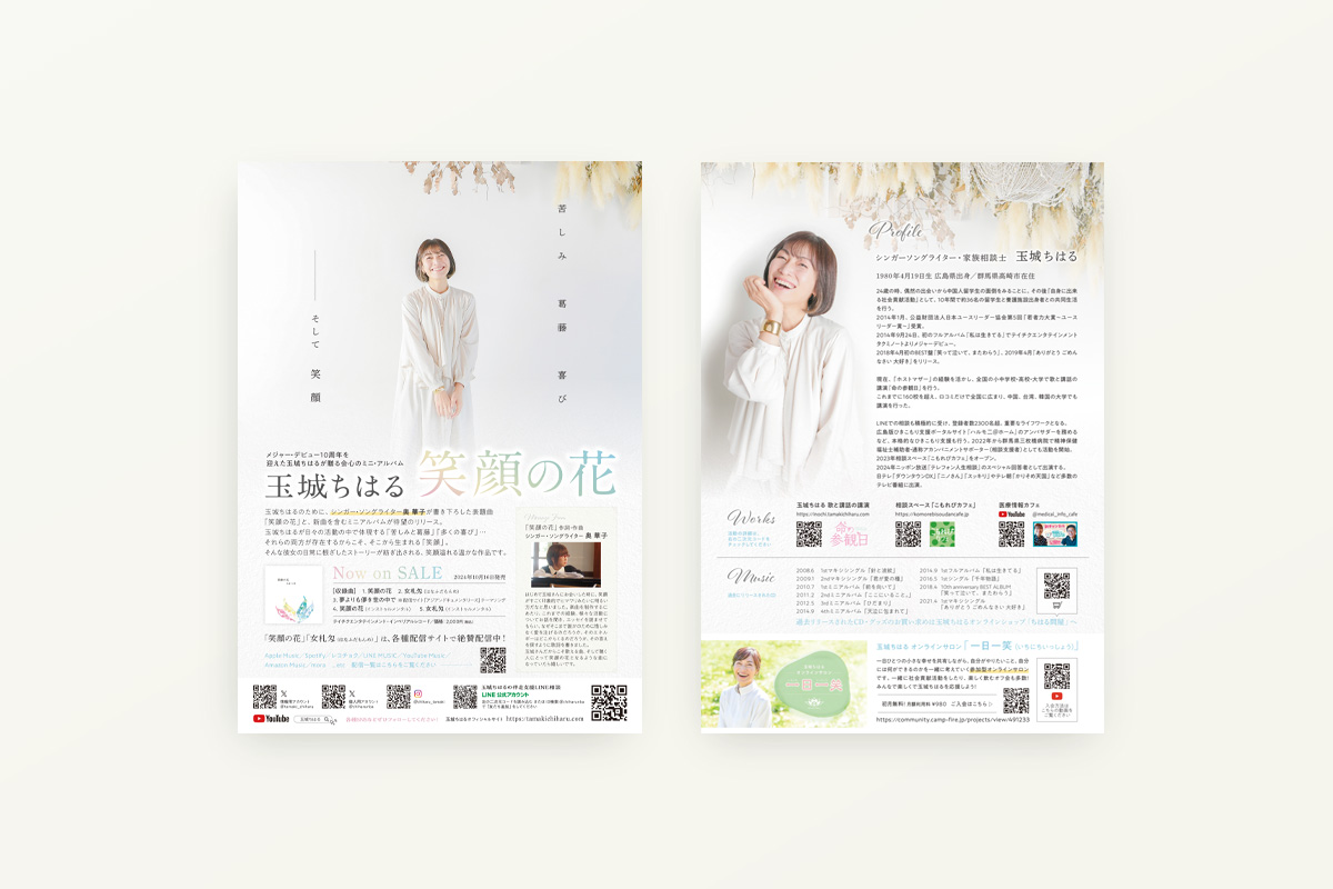 Flyer 2025.11.10 2024 FLYER/POSTER 玉城ちはる 様 「笑顔の花 リリース告知チラシ」 https://tamakichiharu.com/ A4チラシ ギャラリーアーカイブ PREVIOUS NEXT